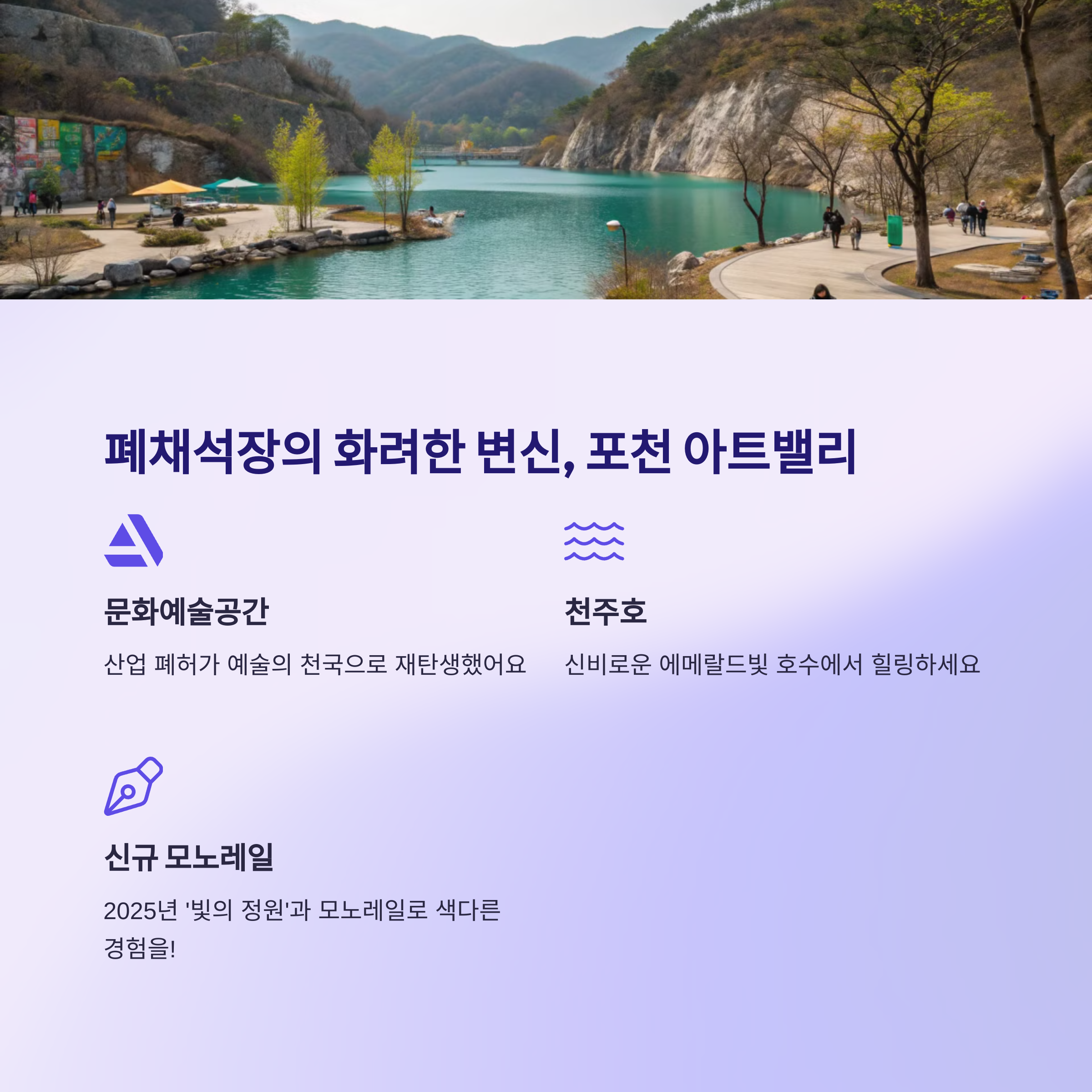 - 포천 여행 앱: 2025년 새로 출시된 '포천트립' 앱은 실시간 명소 혼잡도와 주차정보를 알려줘요. 꼭 다운받으세요!