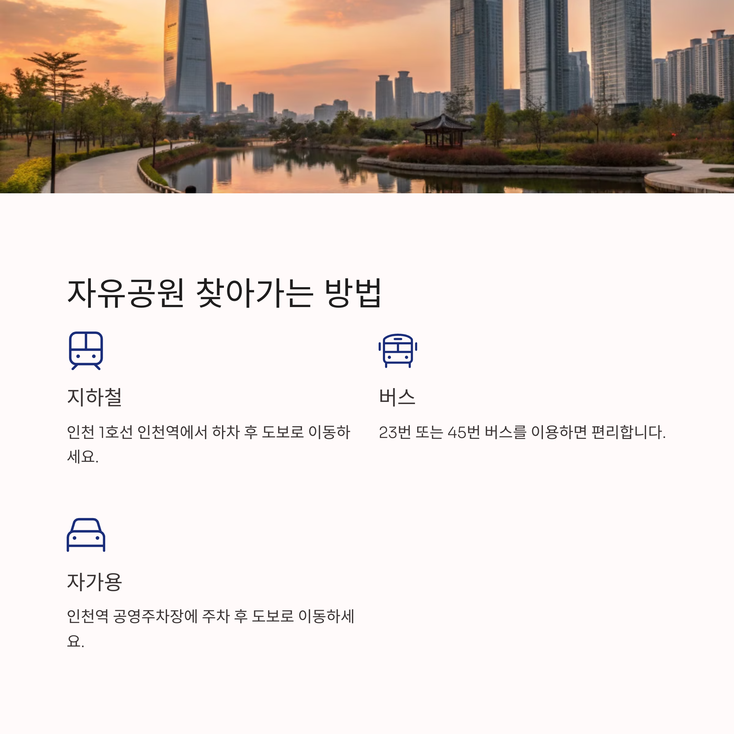 - 자가용 이용 시: 네비게이션에 '인천 자유공원' 검색 (주소: 인천광역시 중구 자유공원남로 25). 주말에는 꼭 아침 일찍 출발하세요!