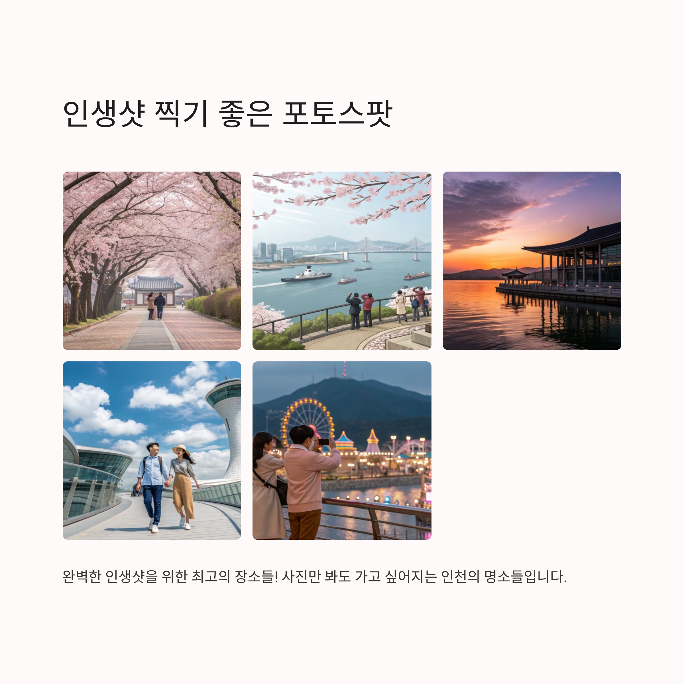 인천 데이트에서 빼놓을 수 없는 것이 바로 인생샷 건지기죠! 제가 직접 다녀보고 사진 찍기 좋았던 포토스팟을 소개해 드릴게요. 이 장소들은 모두 제가 남자친구와 여러 번 방문해서 검증한 곳들이랍니다. 각 장소별로 어떤 시간대에 가면 좋은지, 어떤 구도로 찍으면 예쁜지 팁도 함께 알려드릴게요!