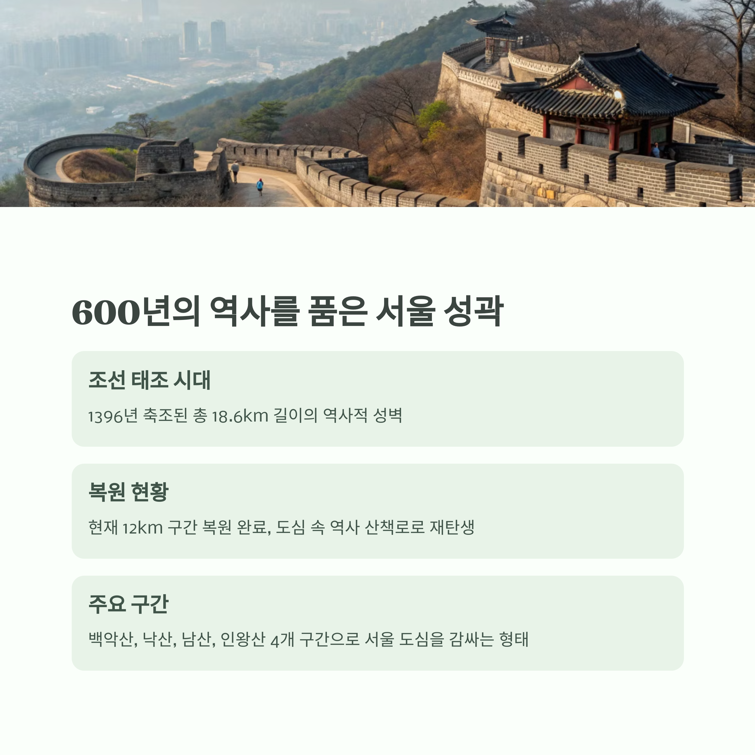 혹시 아세요? 서울 성곽길은 2022년부터 유네스코 세계문화유산 후보로 올라가 있다는 거... 그래서 지금 걷는 이 길이 몇 년 후에는 세계적인 관광지가 될 수도 있어요! 그러니까 지금, 관광객들로 붐비기 전에 미리 경험해 두는 게 현명하겠죠?
