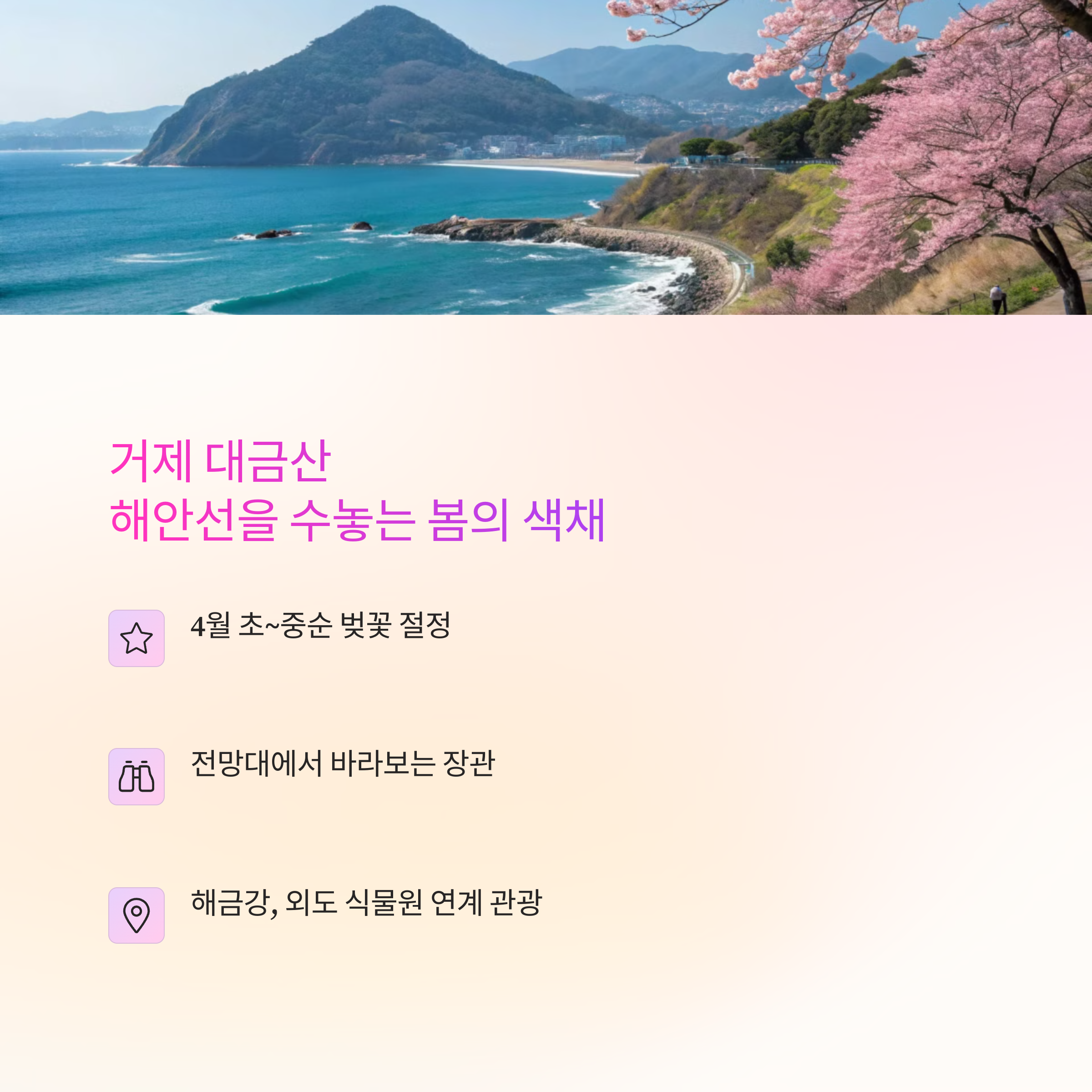 경남 거제시에 위치한 대금산은 해안선을 따라 펼쳐진 진달래 군락지로 유명합니다. 산 전체가 분홍빛으로 물들며, 바다와 어우러진 풍경은 감탄을 자아냅니다. 대금산 진달래 축제 기간에는 다양한 이벤트와 함께 지역 특산물 체험도 가능하여 여행의 즐거움을 더해줍니다.