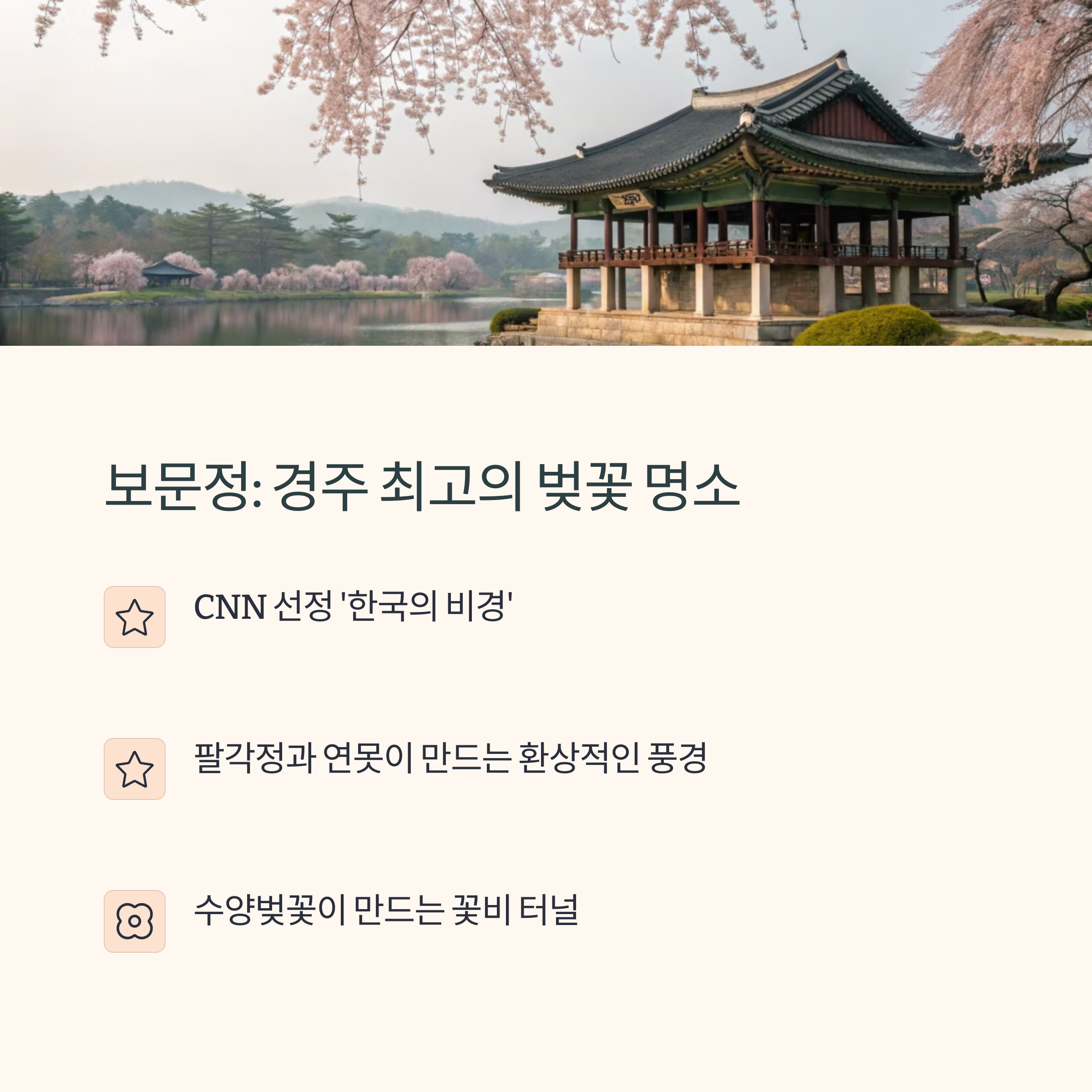Q 벚꽃이 떨어진 후에도 경주를 즐길 방법이 있나요?벚꽃이 진 후에도 경주의 역사 유적지와 황리단길 카페 탐방 등 다양한 볼거리와 먹거리가 있습니다. 특히 야경 명소를 방문해보세요!