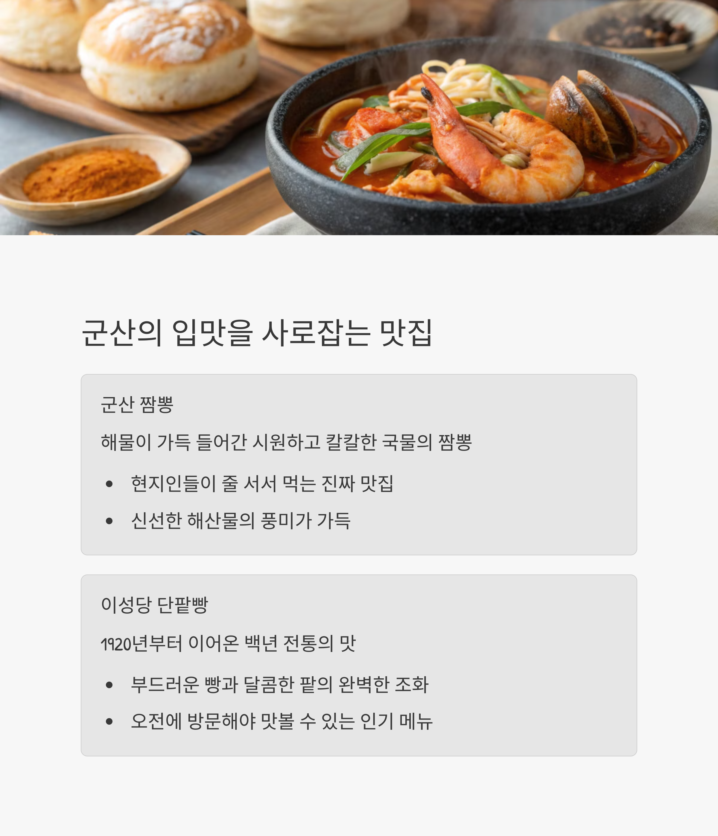 군산 여행 중 절대 놓치면 안 되는 군산 별미들을 소개합니다. 지역 특산물을 활용한 음식들이 많아 입맛을 사로잡아요!