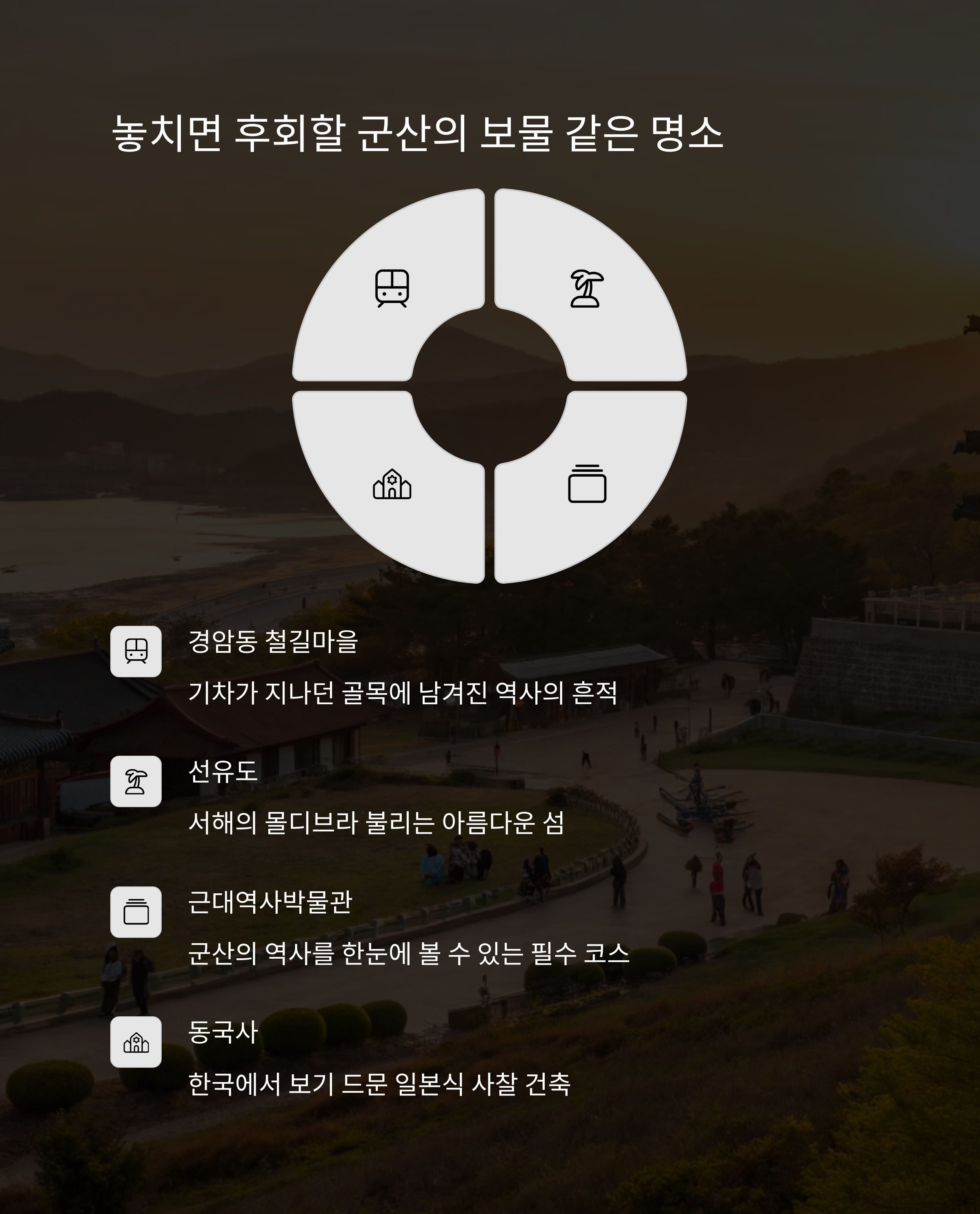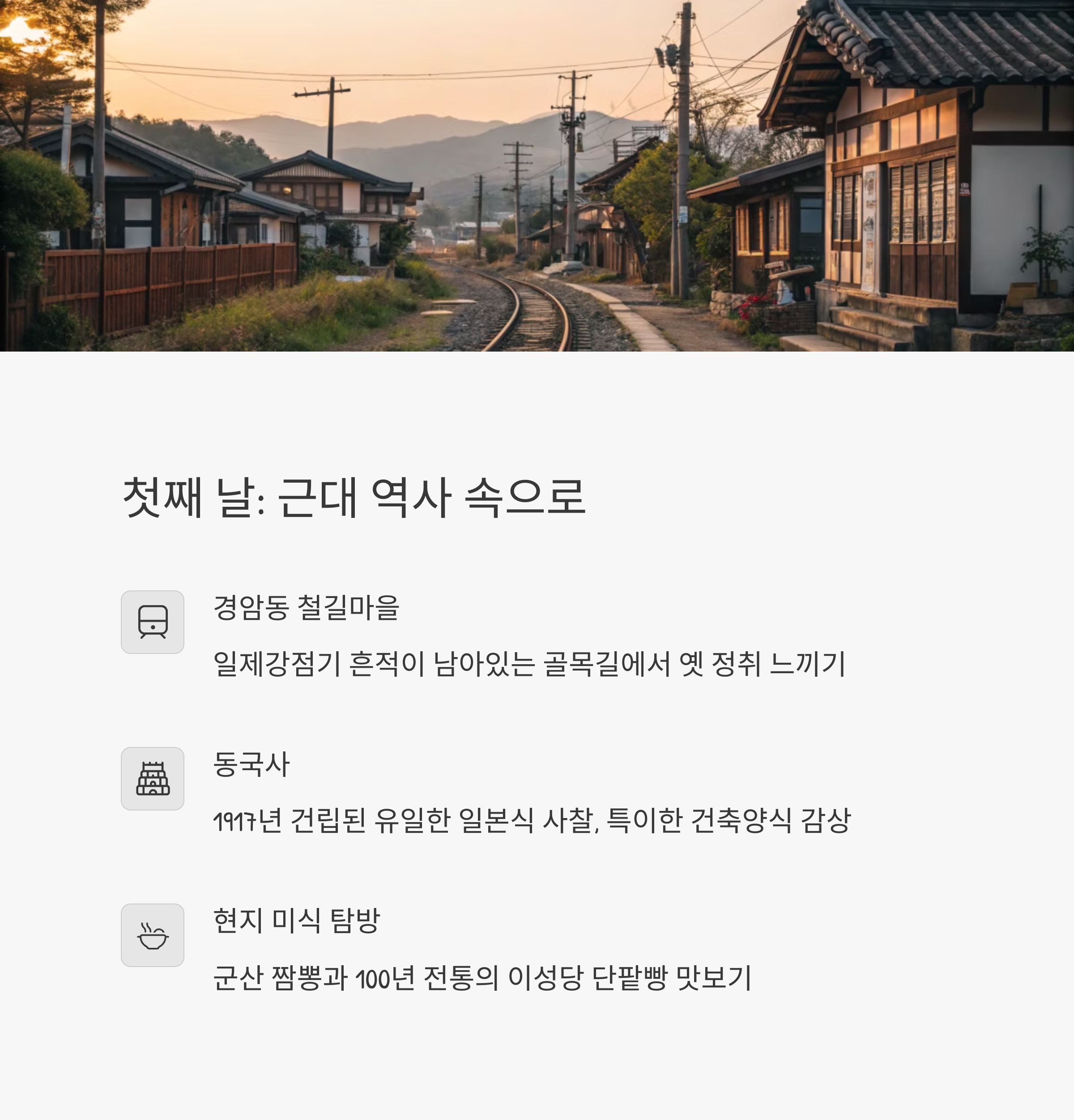 군산의 매력을 가득 담은 1박 2일 여행 코스를 소개합니다! 시간순으로 정리된 완벽 루트를 따라 역사와 자연을 동시에 즐겨보세요.