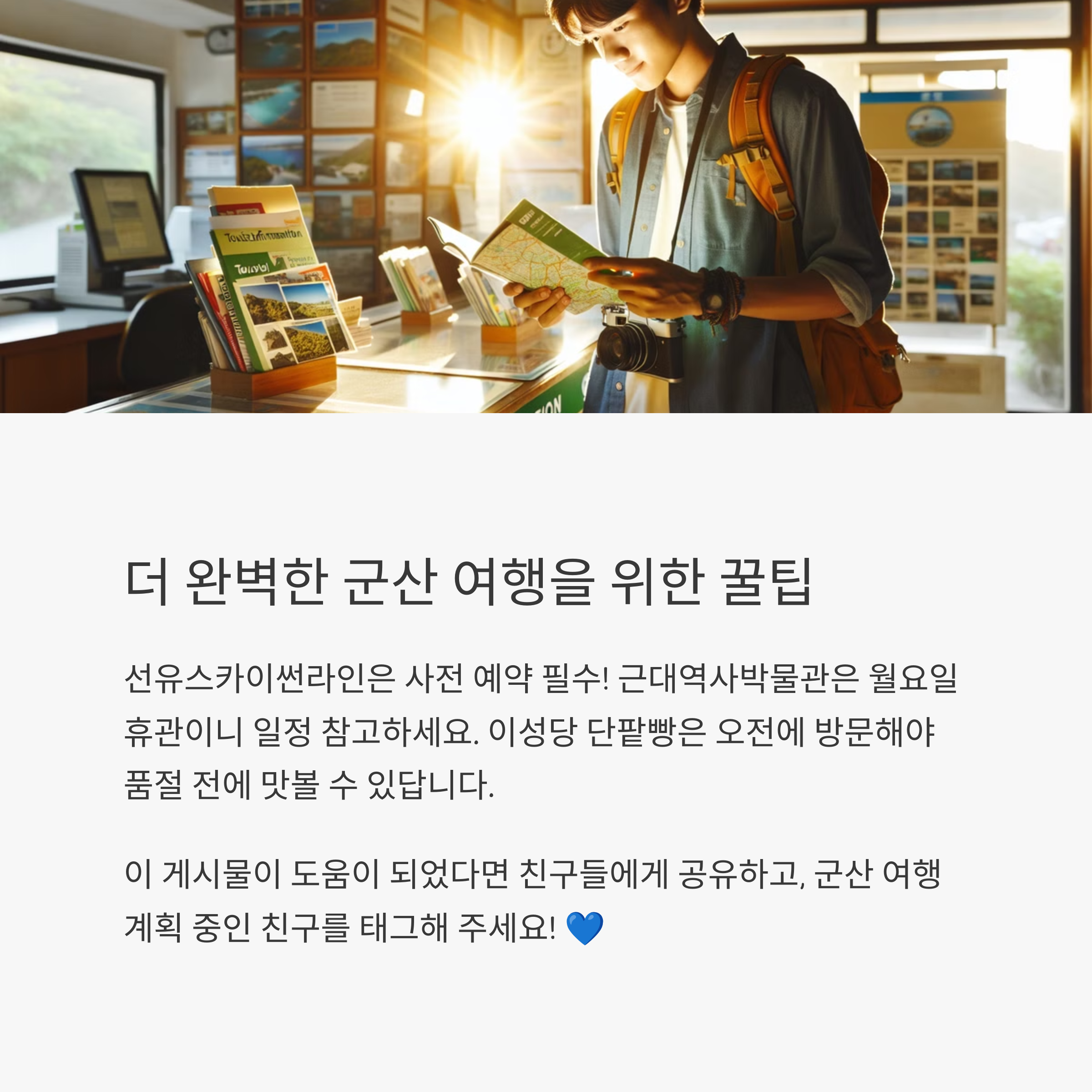 군산 여행을 더욱 알차게 즐기기 위한 꿀팁들을 소개합니다. 이동과 맛집 예약 등 실속 있는 정보로 편리한 여행을 계획해 보세요!