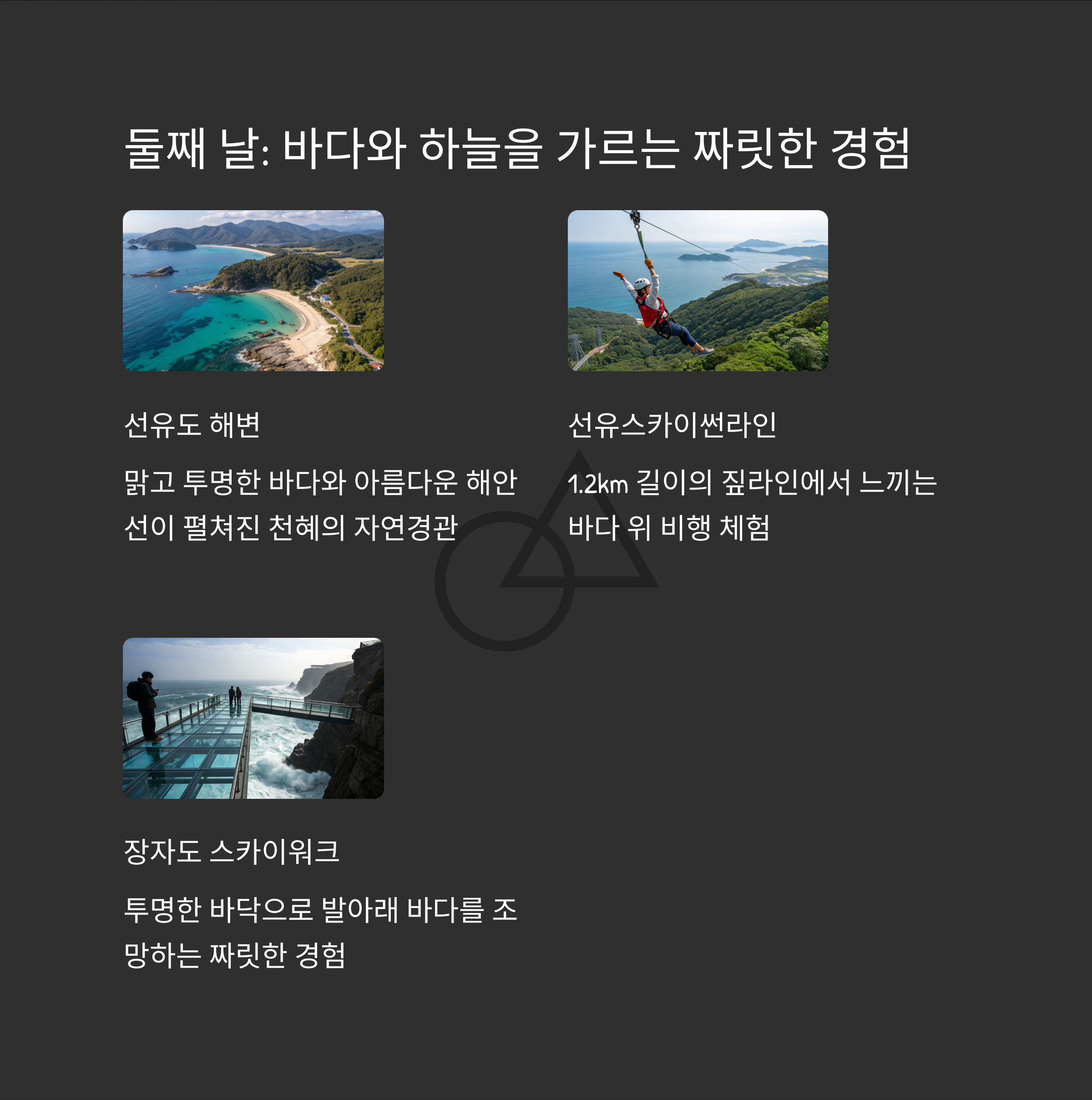 둘째 날 아침에는 군산의 보석 같은 섬, 선유도로 떠납니다. 선유스카이썬라인과 장자도 스카이워크를 걷다 보면 바다 풍경이 한눈에 들어옵니다. 선유도 해수욕장 근처에서 신선한 해산물 요리를 맛보며 여유롭게 시간을 보내세요.
