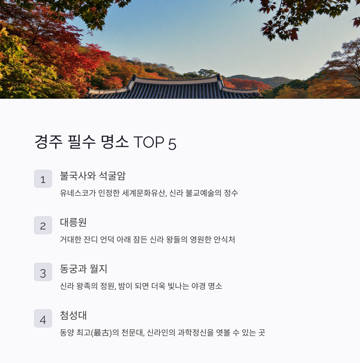 경주에는 정말 볼거리가 많아요. 사실 다 보려면 일주일도 모자랄 정도? 하지만 시간이 제한적인 여행자라면 적어도 이 다섯 곳은 꼭 방문하셔야 해요! 제가 직접 다녀본 곳들 중에서 가장 인상 깊었던 장소들을 추천해 드릴게요.