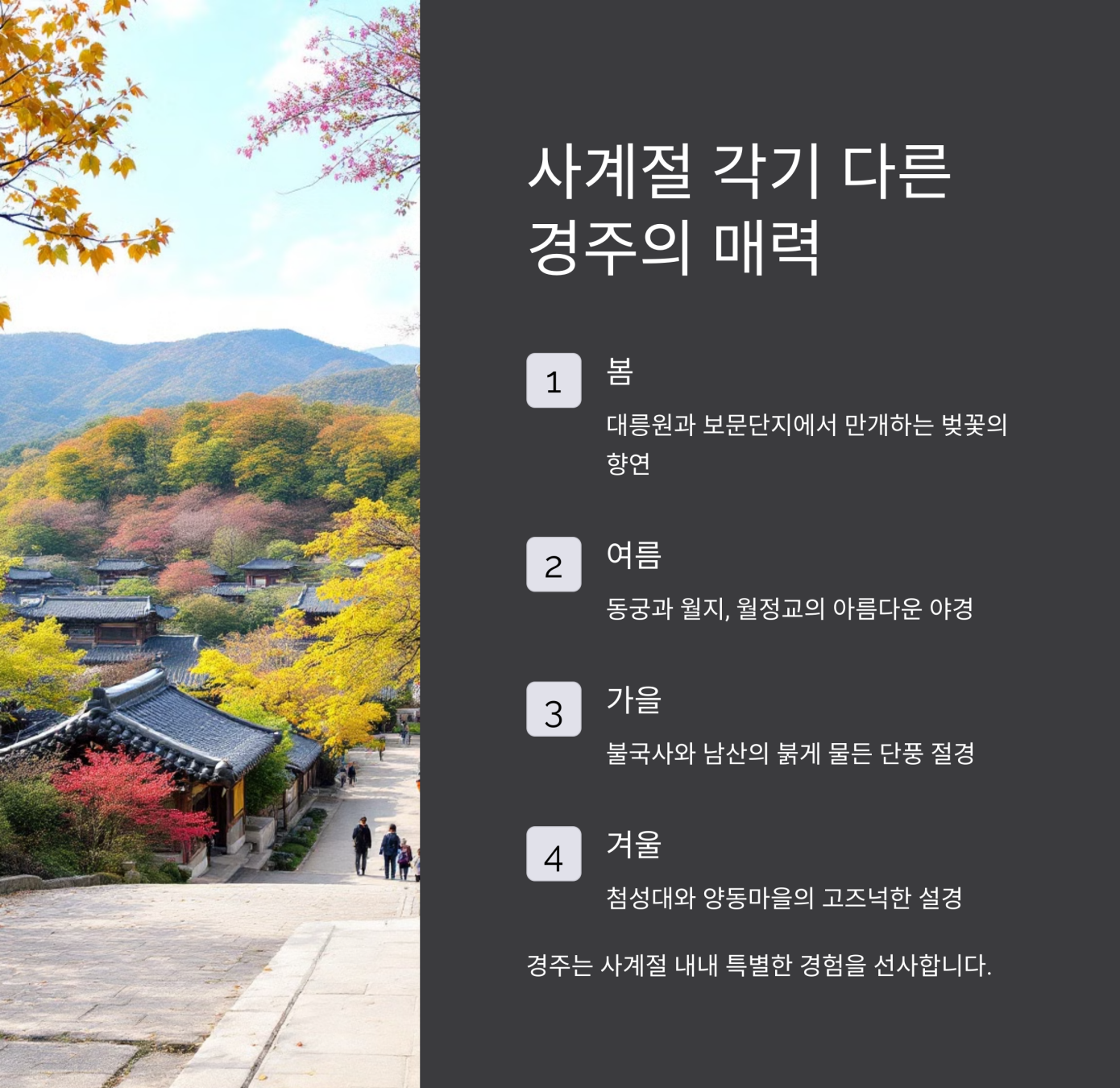 각 계절마다 경주에서 꼭 봐야 할 풍경과 특별한 이벤트를 정리해 봤어요. 여행 계획 세우실 때 참고하세요!
