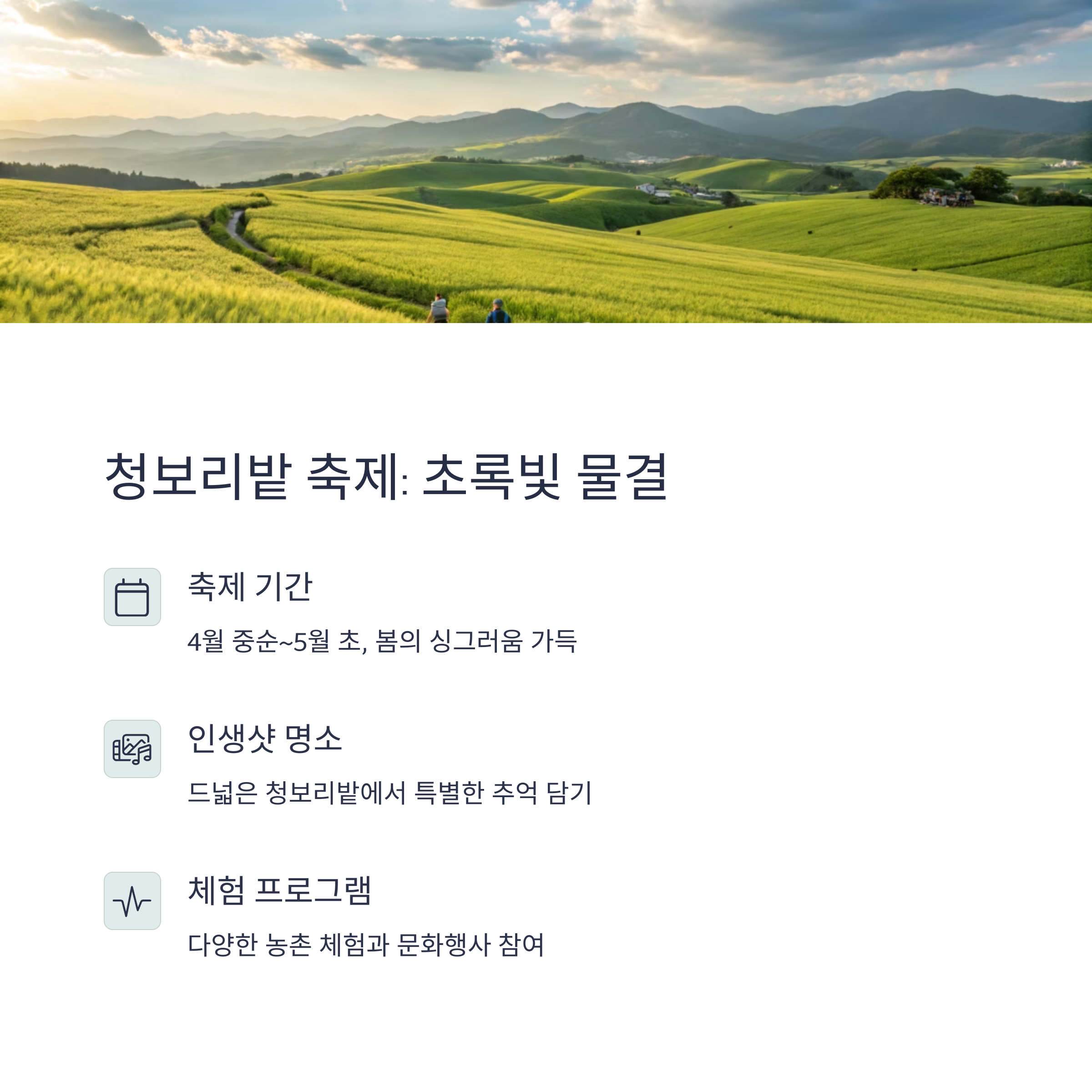 Q 청보리밭 축제에서 꼭 체험해야 할 프로그램은 무엇인가요?청보리밭 걷기 대회와 농산물 직거래 장터가 인기 프로그램입니다. 지역 농산물을 직접 구매할 수 있어 여행의 즐거움이 배가됩니다.