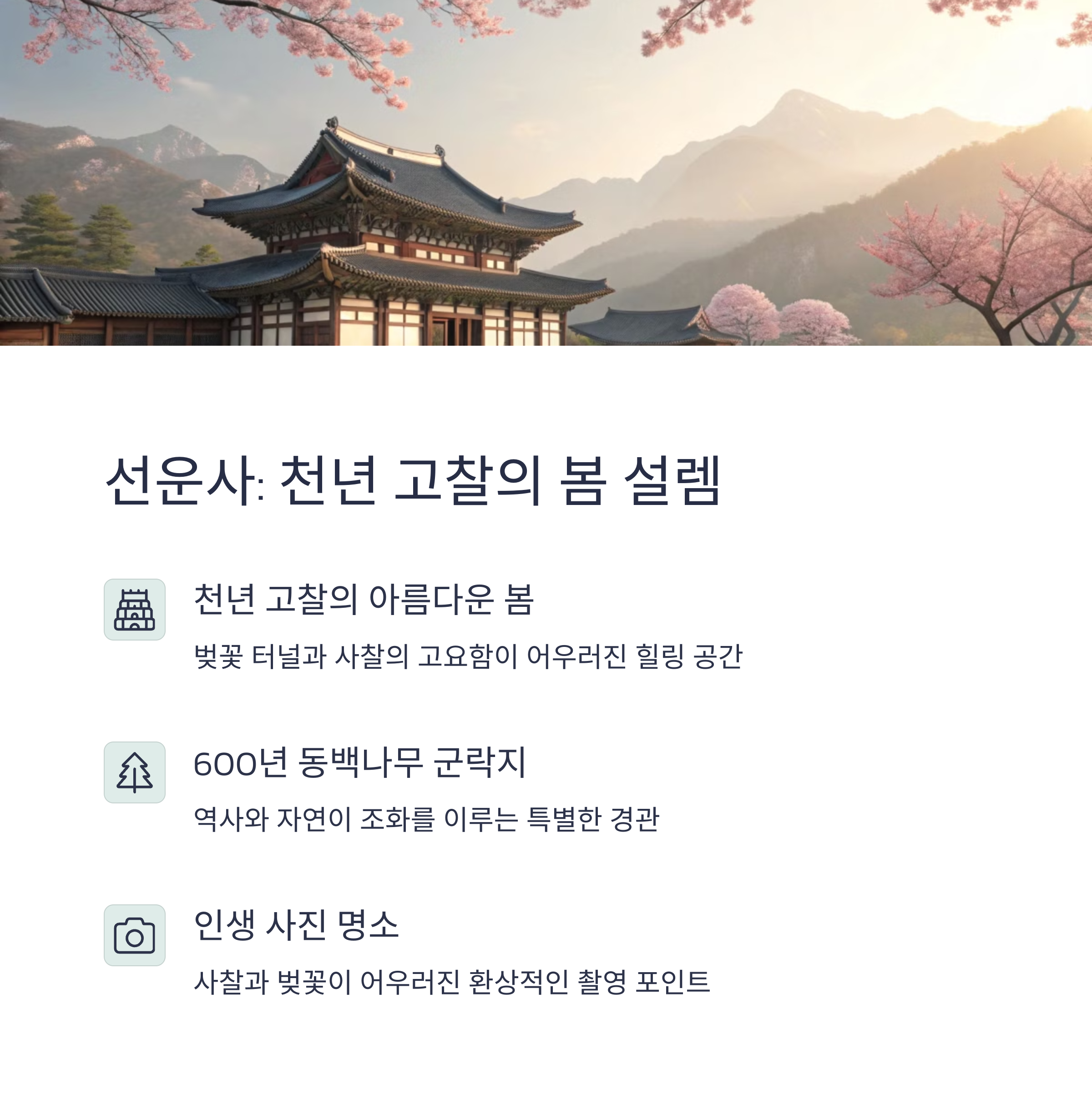 Q 선운사 방문 시 주차는 편리한가요?선운사에는 전용 주차장이 마련되어 있어 차량 이용이 편리합니다. 다만, 벚꽃 축제 기간에는 주차장이 혼잡할 수 있으니 이른 시간에 방문하는 것을 추천합니다.