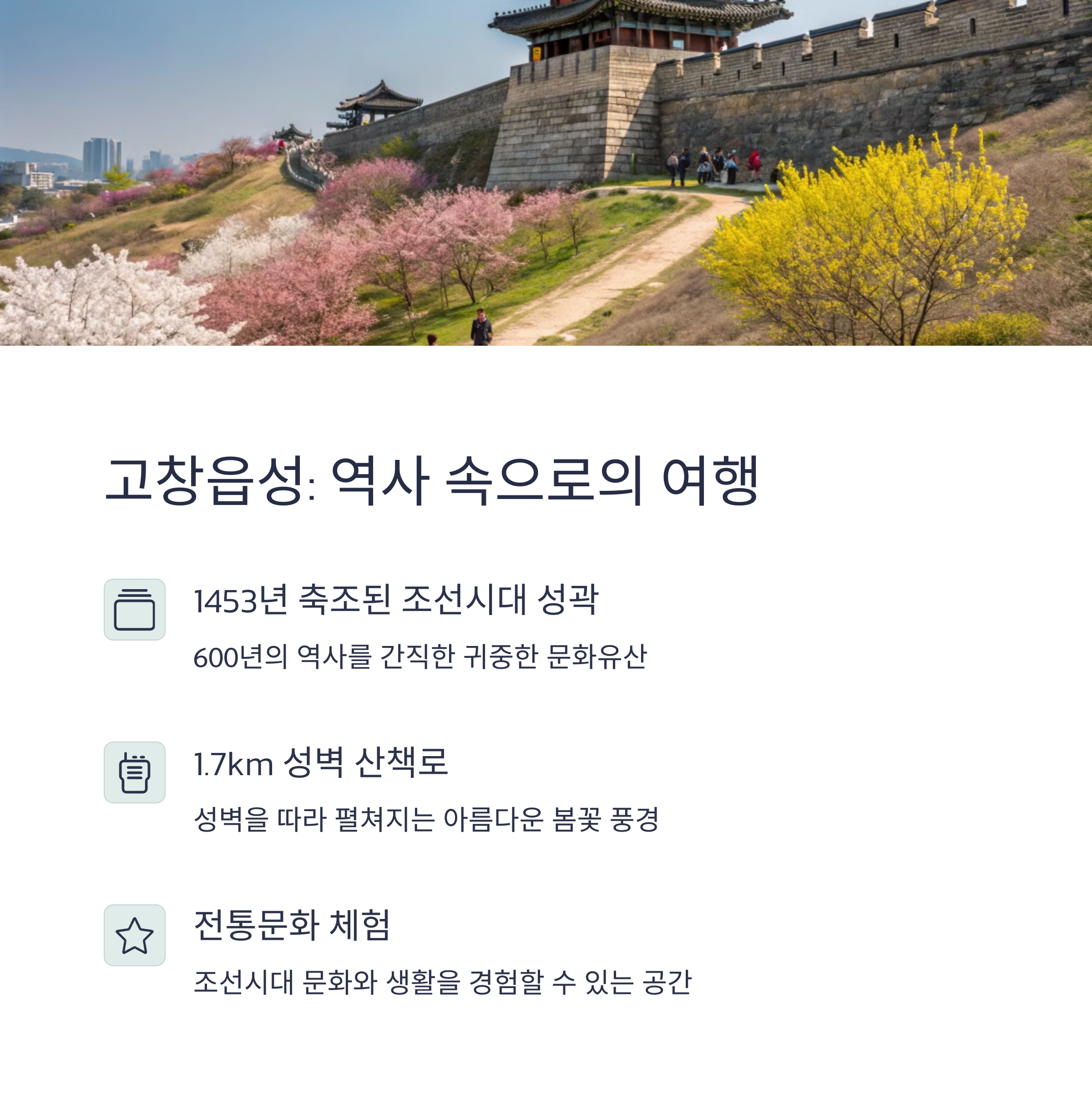 Q 고창읍성 탐방 시 입장료가 있나요?고창읍성은 무료로 개방되어 있어 누구나 부담 없이 방문할 수 있습니다. 단, 주변 박물관이나 전시관은 별도의 입장료가 있을 수 있습니다.