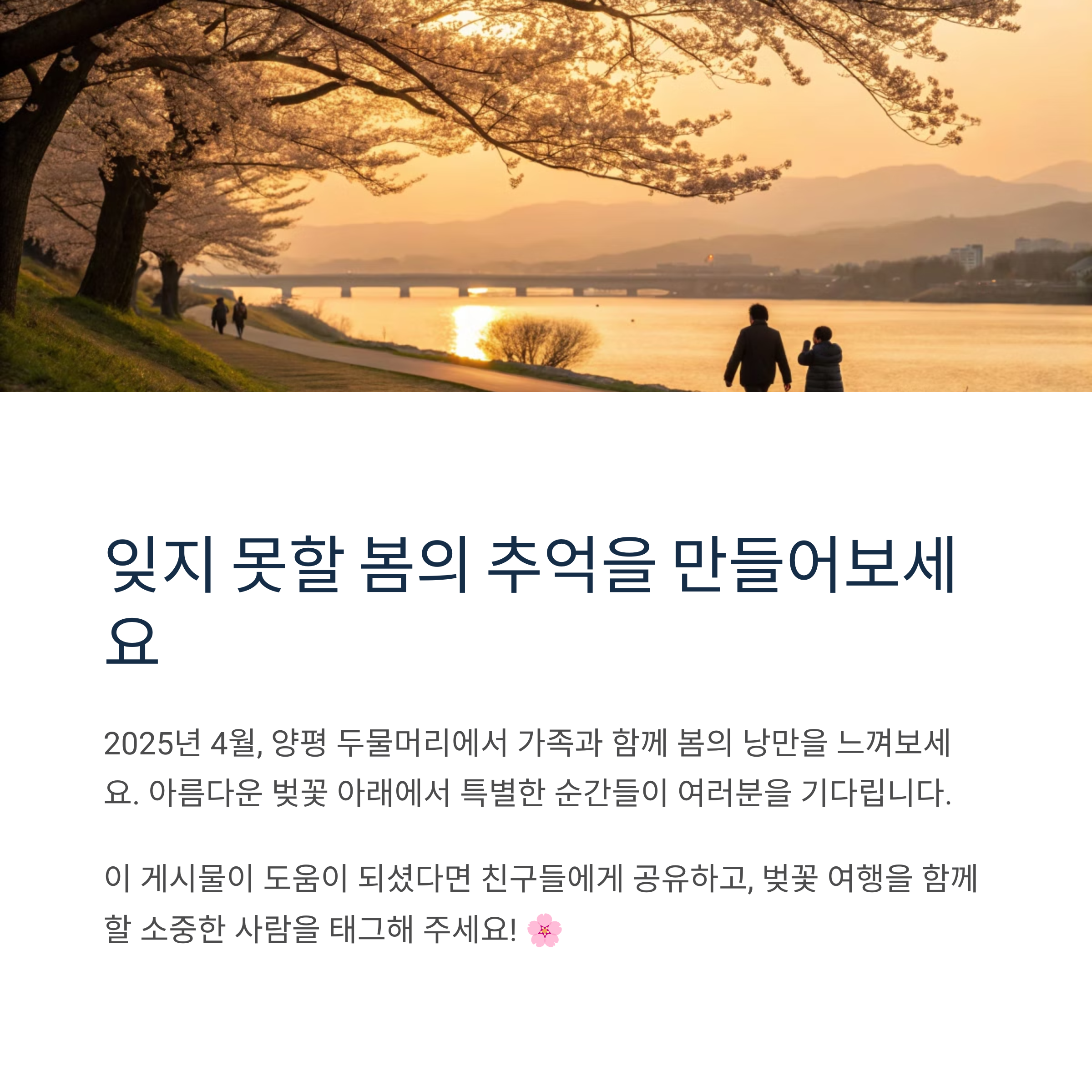 안녕하세요, 여러분! 지난 주말에 가족들과 함께 양평 두물머리에 다녀왔어요. 아이들과 함께한 하루가 너무 좋아서 벌써 다음 방문을 계획 중이랍니다. 남한강과 북한강이 만나는 그 특별한 장소에서 2025년 봄날의 아름다운 벚꽃이 만개한 풍경을 보고 왔는데요, 그 감동이 아직도 생생해서 여러분과 함께 나누고 싶었어요. 특히 올해는 벚꽃 개화 시기가 4월 초로 예상된다고 하니, 미리 여행 계획을 세우시는 분들께 도움이 될 것 같아 정보를 정리해봤습니다.