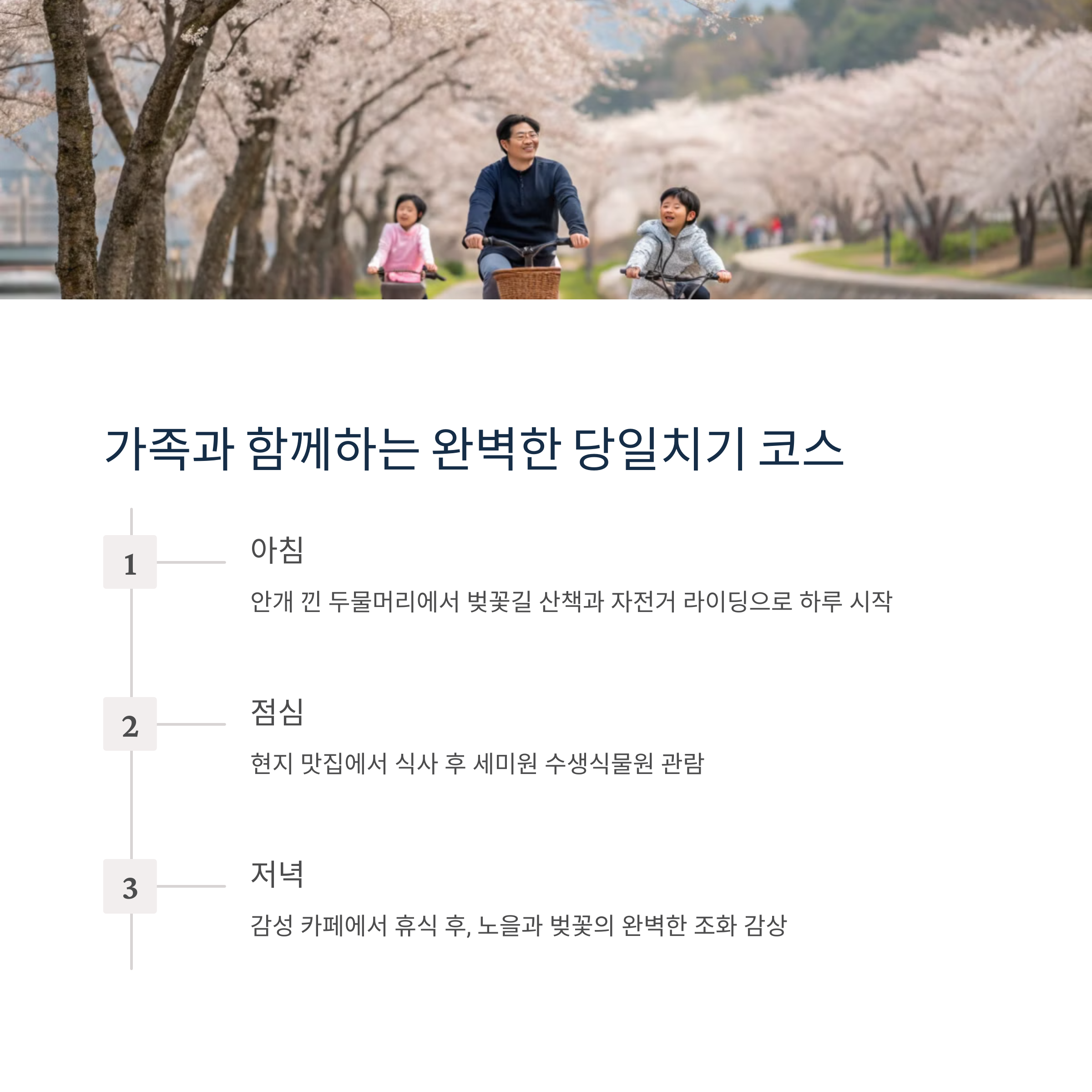 시간 장소/활동 추천 포인트 오전 9시 두물머리 주차장 도착 아침 일찍 방문하면 주차 걱정 없음 오전 9시 30분 강변 벚꽃길 산책 아침 안개와 어우러진 벚꽃 감상 오전 11시 자전거 대여 및 라이딩 가족용 2인/4인 자전거 가능 오후 12시 30분 현지 맛집에서 점심 양평 한우, 산나물 비빔밥 추천 오후 2시 세미원 방문 수생식물원, 아이들 체험 활동 오후 4시 두물머리 카페 휴식 강변 전망 감상하며 티타임 오후 5시 30분 노을과 함께하는 벚꽃길 황금빛 조명 받는 벚꽃 포토타임 이 코스는 하루 일정으로 계획한 것이지만, 근처에서 1박을 하시면 더 여유롭게 즐길 수 있어요. 우리 애들은 특히 자전거 타는 걸 너무 좋아해서 거의 한 시간 반을 타고 다녔네요. 힘들텐데도 계속 타자고... 아빠는 땀범벅이 됐답니다. 하하!