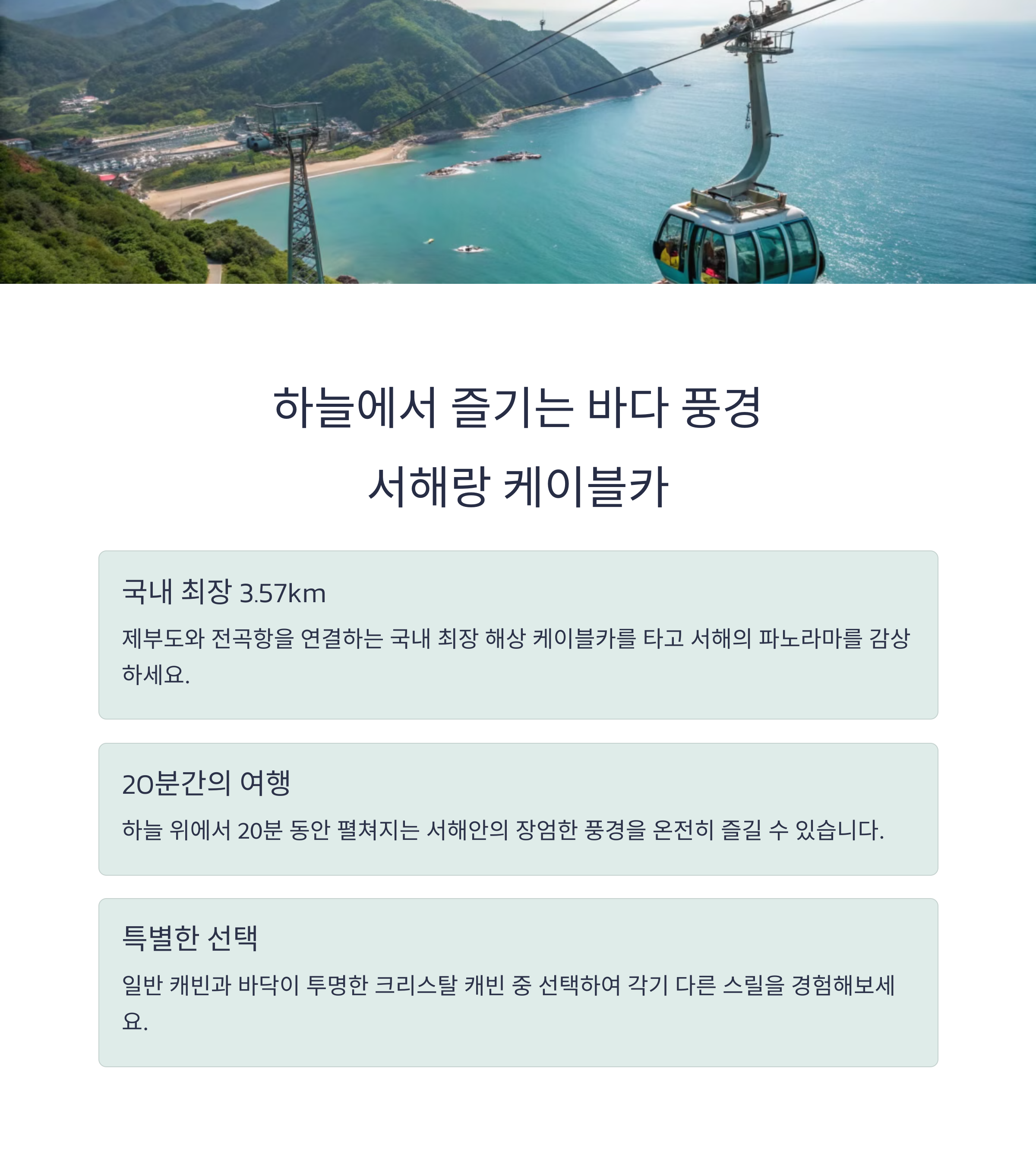 여기까지 서해의 숨은 보석, 제부도 여행 가이드였습니다! 수도권에서 가까운 거리에 있지만 마치 다른 세계에 온 것 같은 특별한 경험을 선사하는 제부도. 특히 2025년 봄을 맞아 새롭게 단장한 서해랑 해상케이블카와 함께라면 더욱 특별한 추억을 만들 수 있을 거예요.